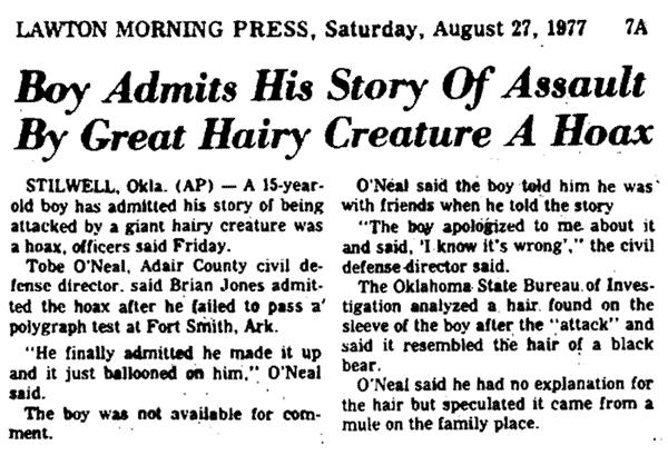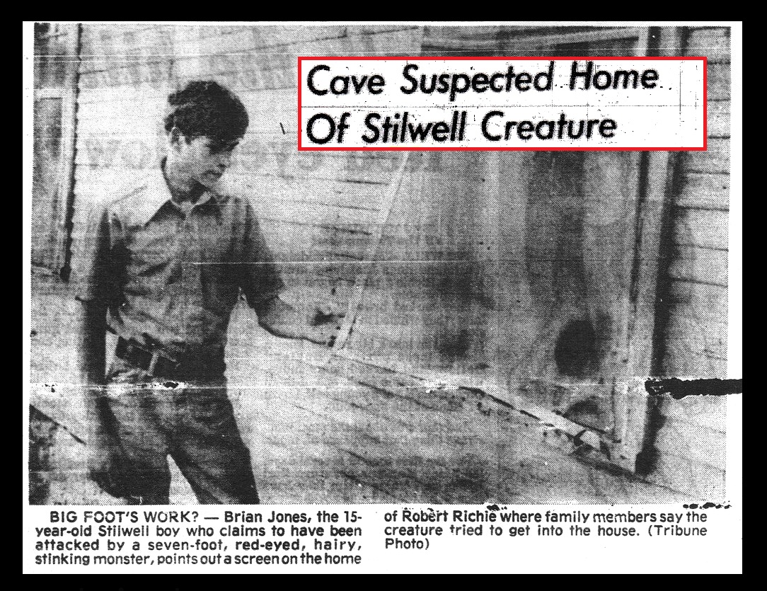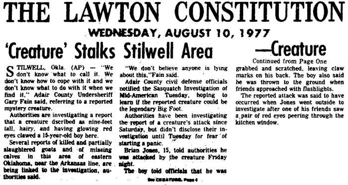 It happened around August 5, 1977. Brian Jones claimed he had been attacked behind a rural Stilwell residence by a large and hairy creature. The creature had attempted to gain entry to the home via a screen. When Jones went out to check out “strange noises” he was attacked. Local authorities responded—along with OSBI investigators. They collected the boy’s shredded shirt and various trace hair samples for later lab analysis (the hair results were inconclusive). State officials would later claim Jones’ story was “just a hoax,” despite a number of other key witnesses that seemed to back up Jones’ version of events. Ironically—just across the nearby adjacent Arkansas border, a second incident involving a “similar creature” followed only days later. This one could not be so easily explained away, as Arkansas deputies found unusual claws marks beginning “7 to 8 feet up” on nearby tree trunks by a farmer’s milk house that “something big” had attempted to access. “Whatever it was, it was definitely not a bear,” county officials concluded. “We don’t know what it was…but it wasn’t a bear.”