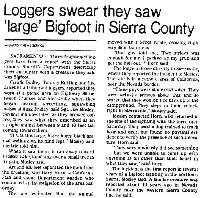 Claude Dudley, Tom Ruffing and Lee Janet III, all itinerant loggers reported they were at the picnic area on Highway 89 between Truckee and Sierraville when they began hearing screeching, squawking noises at dusk Friday, said Sgt. Joe Mosley. Several minutes later, as they brewed coffee, they saw what they described as an upright walking animal between 9 and 10 feet tall coming toward them.