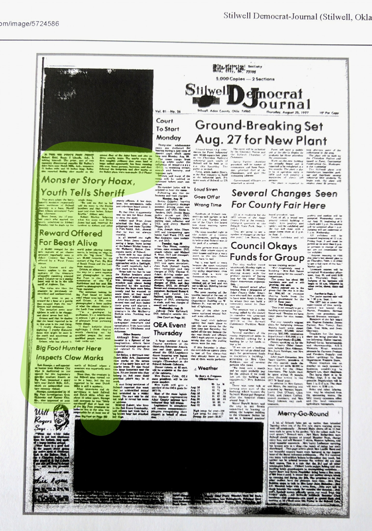 BIGFOOT Foot Hunter Here Inspects Claw Marks Bob Stamps, a self-appointed hunter from Midwest City who is dedicated to the search for the legendary ape-like creature known as bigfoot, inspected a dairy barn near Dutch Mills, Ark.. where an unidentified creature recently visited. Stamps, accompanied by 15 Bigfoot investigators from Oklahoma and Kansas City also inspected an area .Sayi . . rwkssi tk* whit* fatts mm to •** took t|aW tt* MlajaV north of Stilwell where a creature was reportedly seen recently. Since then, the creature in the Stilwell area turned out to be a hoax, but the one reported to be near Dutch Mills is still a mystery, After interviews and observations in both Stilwell and Dutch Mills, which are about 10 miles apart. Stamps told newsman he was "fairly convinced" that at least one of the Bigfoot creatures he believes live in the area was responsible for at least one of (S«« Mg Foot on Pun* 30) Vol. 81—No. 26 county officers. A few days later, the newspapers, radio and television heard about it. Too Late. By that time, it apparently was too late for Brian Jones to deny the story. Abbott said Brian Jones admitted the hoax after a polygraph test made Tuesday in Fort Smith, Ark., showed that he was not always truthful. It all started one night when Brian Jones reported seeing a large, hairy animal at the Robert Ritchie home in the Mulberry Hollow Community north of Stilwell. Jones said he was picked up by the creature and then dropped when his brother approached with a flashlight. The youth reportedly had a claw mark on his back. "Brian told me that he told the Ritchie brothers about seeing the red eyes looking at him through the screen window, and about being attacked by the monster because the boys were being rowdy and he wanted to scare them so they would settle down." Abbott said. After the story got around, several men and boys loaded their guns and started a massive hunt for the, elusive creature in the Mulberry Hollow area. Nothing was found. The story also attracted newspaper reporters and cameramen from television stations in Oklahoma and. Arkansas. Other Reports Although Brian Jones' monster is a figment of his imagination, others have reported strange goings-on not related to the first incident. Ed Bailey, a dairyman near Dutch Mills, Ark., discovered claw marks on the screen door of his dairy barn and on nearby trees. He also found two large footprints near the barn. No one knows who they belong to, but some think practical jokers may be at work. A man living northwest of Stilwell reported this week that an unidentified animal had scratched up a rabbit house. The man said he did not wish to reveal his name or address. Mildred Kaiser, who lives in the Oak Grove Community, told officers last week that, a big brown bear had attacked her dogs."