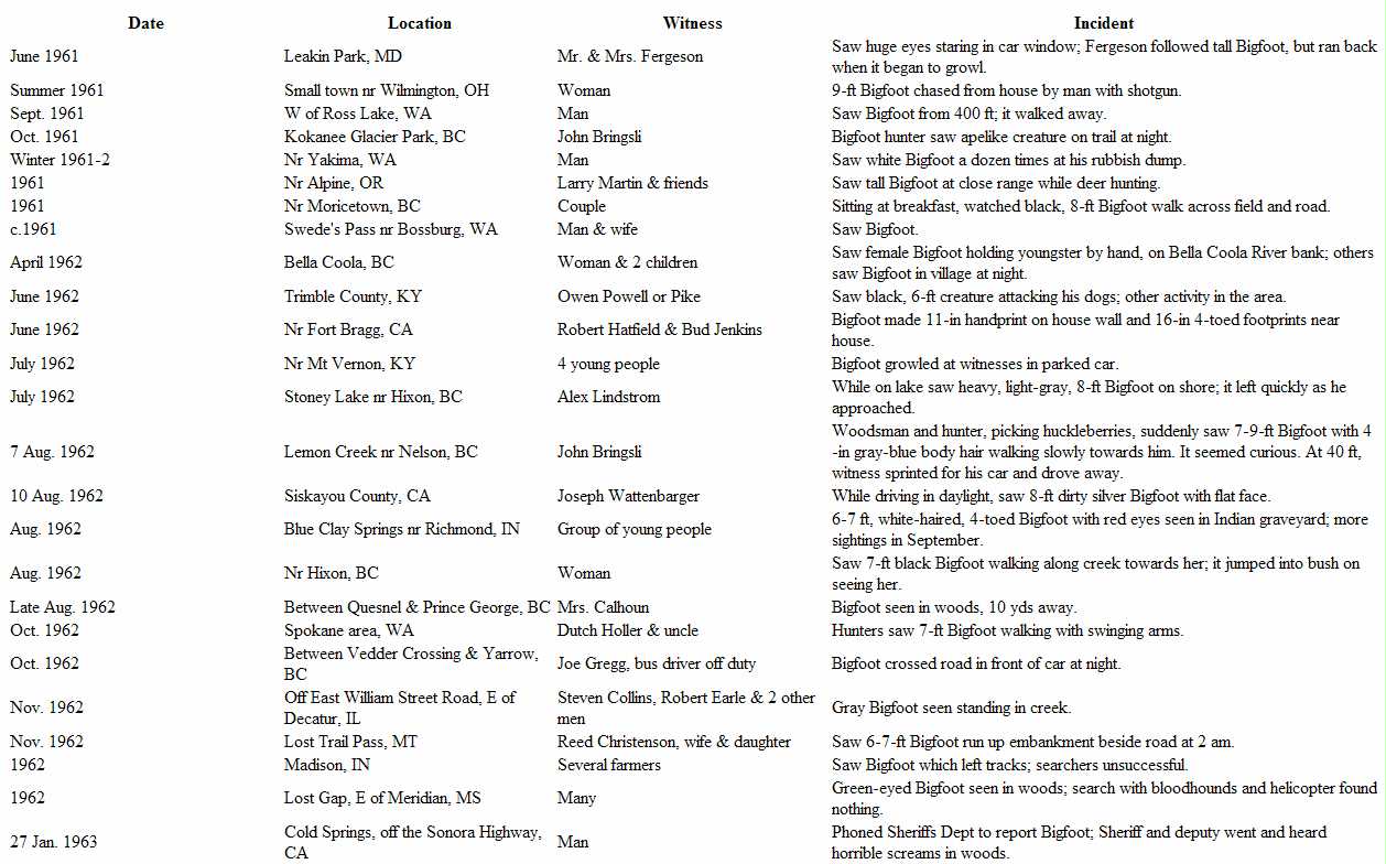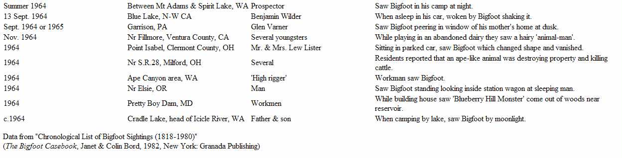 Chronological List of Bigfoot Sightings 1961 - 1964