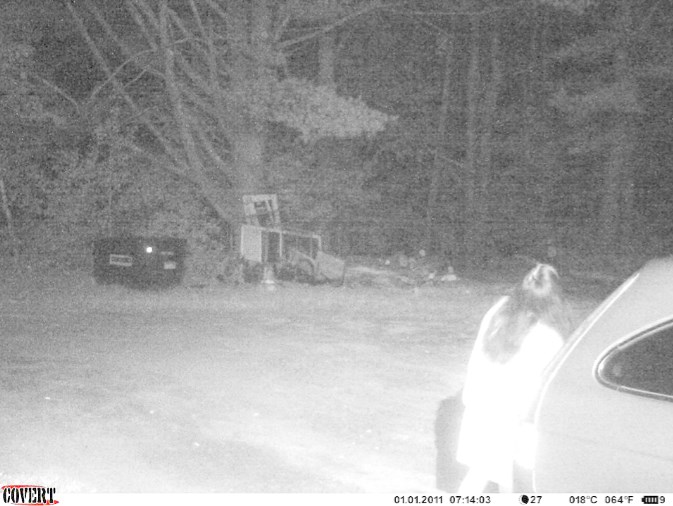 Picture #1: A women is stepping outside her back porch to get the milk she forgot in her car. If you look to the right of the screen doors you can see something that looks hunched over, shoulders facing to the camera. *I see a very dark haired, heavily muscled, (what I believe to be a) juvenile Sasquatch squatting/kneeling behind a small woodpile*