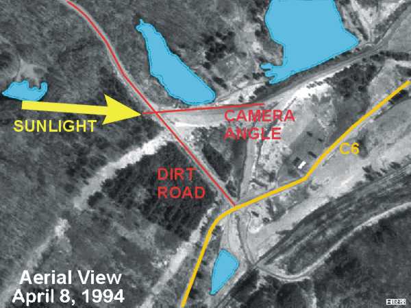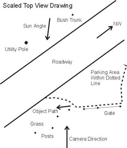 1) To arrive at accurate positional information and grades of the area, topographical maps, USGS online satellite maps, and sun angle data were first consulted. The following data is important for further calculations: Roadway direction, at the objects location, heading away from highway C6 = 317°, Sun azimuth at 6:30 PM, 08/02/92 = 274°, Sun altitude at 6:30 PM, 08/02/92 = 23°, Camera filming direction = 263°, Main road grade downhill towards C6 = 8.7%, Up hill slope of the woods beyond the main roadway = 20%, Altitude drop from roadway to camera = 10 feet. All directions are referenced to true, geographical north, as being zero degrees. Refer to the Aerial View below for illustration.