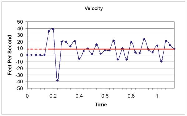 During the period of travel, the object moves a total distance of 9.4 feet at a distance of 225 feet from the filmmaker. The path of the object is nearly perpendicular from the camera’s view as illustrated in the Top View Drawing and also graphed. The position of the object allows it to catch the direct sunlight accounting for the white color. These positions are in disagreement with Claim 7) of the filmmaker for reasons discussed above in section 3) and 7); the camera was also at a zoom of 12%, not 1:1 as stated in Claim 7). The average velocity is therefore 9.4 feet per second or 6.41 miles per hour. The velocity is also graphed, but appears perturbed, due to the short intervals between frames, camera movement, and motion of the individual’s head. These velocity variations seen in the graph do not affect the accuracy of the average velocity, depicted in the graph by a straight red line. Claim 6) of the filmmaker, concerning the object moving 28 feet in 4 steps at a speed nearly unobtainable by humans is completely incorrect. The actual speed, which is also downhill, is a fast walk or slow jog – about a 9 to 9.5 minute mile in jogger’s terminology. The only guess of how the 28 feet was arrived at, may be related to another error made by the filmmaker in calculating the elapsed time since filming: The filmmaker continually states as in Claim 1) that 17.5 months elapsed, but 16.5 is obviously the correct value. The filmmaker also considers the apparent posts in the film to be 9 to 10 feet apart and the object is said to just cross 3 posts. Is he making the same mental error, 3 posts X 10 feet each = 30 feet, instead of the correct answer of 20 feet in this example? Try this, often confusing issue, on a piece of paper to better understand the point being made. However, the apparent posts visible in the video are not 10 feet apart, but more like 5 feet apart to further confuse the issue. This is why a proper reference object was carefully selected in part 5) of the Analysis Details section.