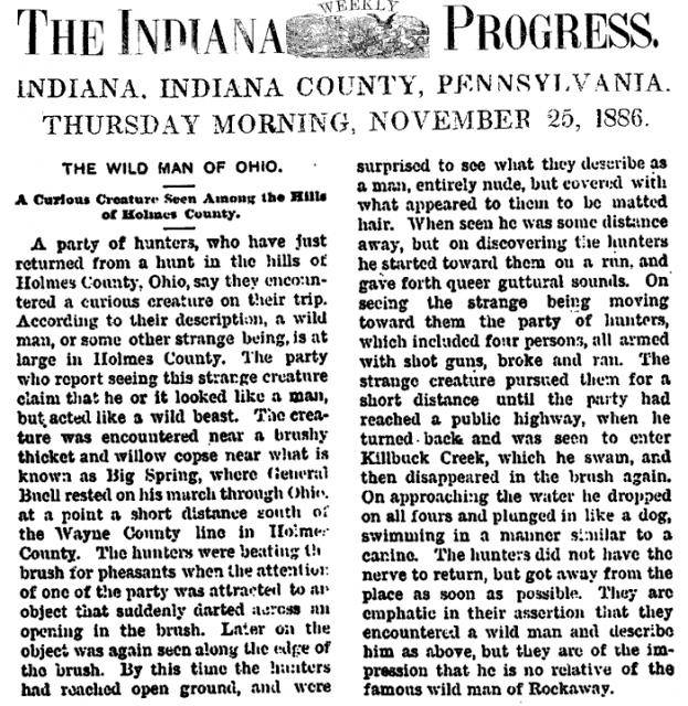 A party of hunters, who have just returned from a hunt in the hills of Holmes County, Ohio, say they encountered a curious creature on their trip. According to their description, a wild man, or some other strange being, is at large in Holmes County. The party who report seeing this strange creature claim that he or it looked like a man, but acted like a wild beast. The creature was encountered near a brushy thicket and willow copse near what is known as Big Spring, where General Buell rested on his march through Ohio, at a point a short distance south of the Wayne County line in Holmes County. The hunters were beating the brush for pheasants when the attention of one of the party was attracted to an object that suddenly darted across the opening in the brush. Later on the object was again seen along the edge of the brush. By the time the hunters had reached open ground, and were surprised to see what they describe as a man, entirely nude, but covered with what appeared to them to be matted hair. When seen he was some distance away, but on discovering the hunters, which included four persons all armed with shot guns, broke and ran. The strange creature pursued them for a short distance until the party had reached a public highway, when he turned back and was seen to enter Killbuck Creek, which he swam, and then disappeared in the brush again. On approaching the water he dropped on all fours and plunged in like a dog, swimming in a manner similar to a canine. The hunters did not have the nerve to return, but got away from the place as soon as possible. They are emphatic in their assertion that they encountered a wild man and describe him as above, but they are of the impression that he is no relative of the famous wild man of Rockaway.