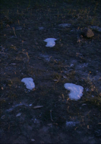 That didn't surprise me as much as that both feet landed in the same position, and the left foot was turned to the far left-just as the two prints showed. The creature then walked up and across the property, leaving faded prints that eventually just disappeared from the rock hard surface.