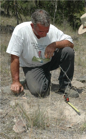 While Rex measured I went searching (walking almost a kilometre from Lloyd-the film crew & Rex) and discovered a few more faded indistinct prints, although this time in very hard mud. I also noticed their were vast amounts of these wild round melons along the creek, obviously they had been eaten by many creatures, none of which I believe were the creatures we