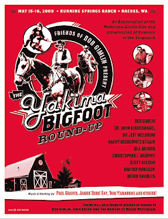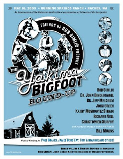 BIGFOOT ROUND-UP May 15th and 16th, with BOB GIMLIN himself up in Yakima, Washington. Of course, for those of us who did not know about it on the first day, tickets are sold out. We at BIGFOOT BOOKS, however, are lobbying for some standing-room-only admissions. There is a waiting list, but JAMES BOBO FAY has told me that even Peter Byrne couldn't get bumped up to the top of the list! Bobo says: "This thing is going to go off!!! It's truly going to be a historic event. Hancock House is even doing a book about it. ...plus, the people who are calling for last minute tickets are true luminaries. We got some real VIPs coming." Well, bummer! Maybe we can convince them to hold it out in the old rodeo grounds or something?