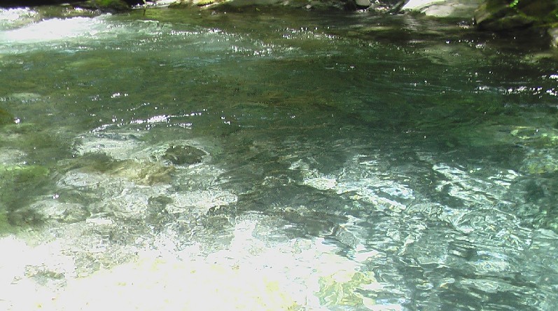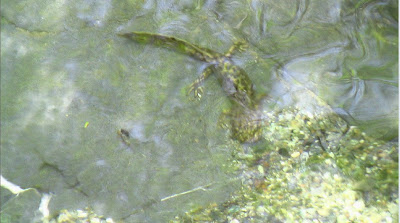 MK DAVIS: The photo that I sent you was that of a salamander of about ten inches long that I got a very close look at while trekking up Notice Creek. The one that I saw in Bluff Creek, appeared to be quite a bit larger than that. It was at the bottom of the pool however, but the water there was very clear, and I could see the same mottled pattern on it. I was not there for that reason, however, so I did not fully appreciate what it was that I was looking at. We have small salamanders at home, but they stay out of sight mostly. Nothing like what I saw there. Here's a view of the pool that I saw it in. This was taken the next day during bright sunlight. There is a lot of glare in the photo, but on the previous day, later in that day, there was very little glare, and I could see it pretty good. I know a bit more about them now, having had this experience and doing some checking, but at the time, I made a note of it, but did not study hard on what it was. I just wrote it off as a large fish, until I saw the one up close on the next day. I estimate its length at around three feet. It made the second one I saw look like a baby.