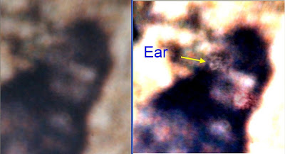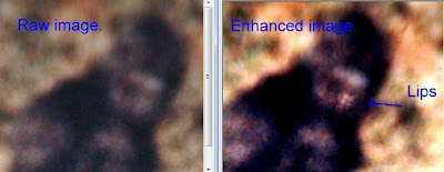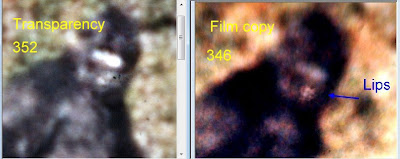 The first such feature that I was to find on the film were features on the face,the lips in particular. The film must be exhaustively advanced frame by frame, until the synchronicity between the filmogrpaher and the film subject are aligned, and the lighting good. This occurs as she is beginning to look back towards the men. [See photo.] The image on the left is the "raw" image from the film. The right has been filtered. This filtration is the same technique used to filter the sun and planets in order to see the different wavelengths of light. If very subtle lips can be made to more dominate the image by splitting the two very different light wavelengths and then boosting the diminished tones. It is not in any way "adding" anything to or taking anything away from the image. It is simply making the more subdued tones dominate the image. This is called enhancement. When I was able to get access to the transparencies from the original film, I was able to confirm that [this] image did indeed contain the the lips of the individual, and those lips were of a "full" nature and appeared human. When the two frames are animated then a flexible, dynamic mouth becomes apparent. While following the film frame by frame, I could see that the hair on the side of the head was quite long, and was blowing in the wind. I followed it until I saw it blow forward, over the ear, and there was the ear itself, in plain view briefly until the hair fell back over it.