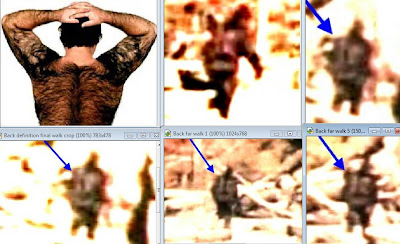 The ear appeared to be of normal proportions. There was nothing "non human" about it. If the viewer looks carefully at the raw image on the left, the ear can be seen without the aid of enhancement, but much better with it. The skin of the subject is of a different tone than that of the hair. The hair is very light, and is easily penetrated by the sunlight. The sunlight reflects off the skin and back through the hair. This essentially creates two reflective surfaces that are of two different tones. These tones can be split apart and the two tones treated independently of each other. By doing such, I was able to turn "down" the tones of the hair, and boost the tones on the skin. I did such to all the images where the sunlight was striking the back directly, and when I animated the sequence, the muscle movement along the back and spine and gluts became much more obvious. Here is a file that demonstrates this. Again, this was very laborious. The gluts can also be seen to move independently of each other.... There are many more files to consider that I don't have time for here, but I think you can see my point that, the question of whether this is a man in a suit can be solved with the film itself, and leaves little room for argument.