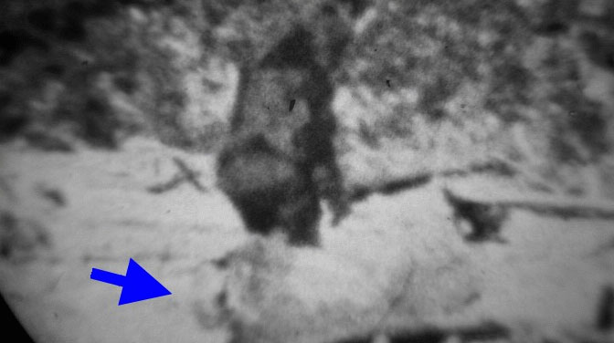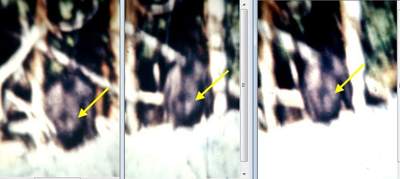 The various copies also have various degrees of cropping applied to them, mostly to make the film subject appear larger. This, however robs the analyst of hard data that is contained in the periphery of the film. I have worked with transparencies made from the original film, that do not suffer from the vignetting that is found on a lot of copies. Vignetting is a distortion around the periphery of the frame that is a lens defect and is exacerbated by copying. These transparencies are sharp edge to edge. I'll attach an example of their quality. The various copies also suffer from chromatic aberration. This becomes more apparent when magnifying the image, and can largely be corrected for with filtration. The black and white stabilizations that you were referring to were not only hand stabilized, but each and every frame had the chromatic aberration corrected for, before reassembling the film in its stabilized form, this contributed mightily to the amount of detail that was seen in the stabilizations. It was all very labor intensive.