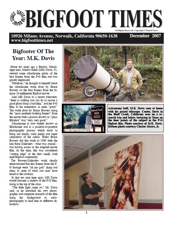 Images: Above, the famous "LOOK" frame 352 from the Patterson-Gimlin Film (PGF); Below, the issue of Daniel Perez' BIGFOOT TIMES featuring M.K. Davis as the 2007 "Bigfooter of the Year," and MK with his telescope.