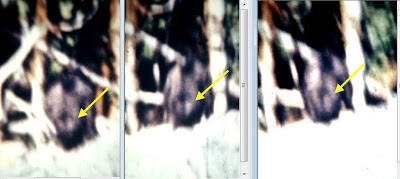 I mentioned earlier that there were two reflective surfaces on the Patterson film subject. One being the hair, which is thin and wispy. The other being the skin itself, which is of a lighter color than the hair. The sun strikes both surfaces, i.e. the sun penetrates the fine layer of hair, then reflects off the skin and back through the hair and to the camera lens. This is why the muscle movement is so easily seen, because the hair does not obscure "totally." Here is an example in the attached file called "Backhair pattern." There are many places, in the film, where the sun strikes the subject's back in such a way that the skin is visible beneath the hair. Here are some samples in the photo attached called " Back detail collage." There are many more as well.