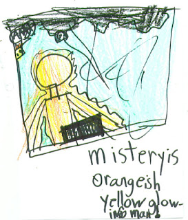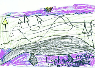 Second grader, Denali Brown, of Willow Creek has reported several cryptic encounters in the last few weeks, including Bigfoot, Aliens, and a river creature much like the Loch Ness Monster. We quote:"Loch ness monster seen at river behind fresh produce farm. 7 year old girl saw back of Loch ness monster. Mysterious orange-ish yellow glowing man seen at Steve Streufert’s house. Big foot seen twice ." The caption of this drawing, of a sasquatch seen moving behind a firewood pile in the yard, reads "Bigfoot seen..., or just a dream."