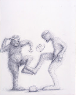 No other artist reveals the strangeness of Eureka and Humboldt County at large better than Jesse Wiedel. His art contains strange juxtapositions of the weirdly normal, commonplace banality and festering decay surrounding bizarre characters in epic battles and confrontations with the demonic forces within themselves, the cultural and economic constraints that contain them, the horrid aberrations of degeneracy and failure. A parking lot beside a liquor store becomes the stage of warring titans missing teeth, tweaked to the extreme, wife-beater shirt-wearing degenerates, striving for perverse ends, reaching for mutant transcendence.This would not be Humboldt if Bigfoot did not enter the picture; and so he does, here confronting a wrestler or boxer bearing a false leg in triumphant defiance. A sinister mystery lurks behind every pretty Old Town Victorian storefront. These alleys were places where the whores sang from windows above, and junkies still lurk among the ghosts of murder victims and the expelled Chinese, the dark side of the gold and lumber booms.