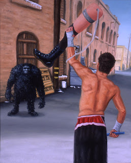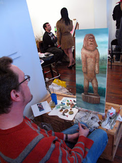 BF BLOG: In the context or your larger themes and the content/characters of your art, how does BIGFOOT fit in? And what does BF symbolize in the context you have used him: standing threateningly in an alleyway, fighting, two-headed and lying stuffed on the floor, or as a hippified statue? Etc.