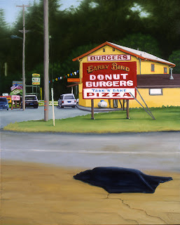 In those thick, dark forests that humans have tried so adamantly to destroy, a living mystery still walks: the real spirit of the living Northwest. Bigfoot appears again as hippie hackeysackers, mocking the feel-good contemporary culture of the potheads. Wiedel's characters are more hardcore. His environments themselves play a character role, embodying in their tacky and rotting bad taste an externalization of the human spirit that has created such a place. A painting done of the Bigfoot Burger joint in Willow Creek, seen from the parking lot of Bigfoot Books, shows a malignant black blob that could be a tarp covering a corpse, or a projection of the terror that lurks at the heart and history of ordinary places.