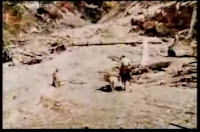 One frustrating thing with the P-G film is that it is difficult to catch the first glimpses of the Sasquatch creature as it moves off from the creek side right at the start of the film (and often these are edited out from documentaries). At this point Patterson is probably in a state of shock and extreme excitement (not to mention most likely some fear of this apprx. 7-foot cryptid creature), having just gotten away from the panicking horses. At the start of the film he is running up to and across the creek to get a better filming vantage point. We have endeavored to freeze-frame these moments, otherwise nearly totally lost in blur. The first creature image above shows the first clear glimpse of the film's subject. Here we may see the wet sand at the creekside, and then in following frames a fleeting glimpse of the water of Bluff Creek, to the left.