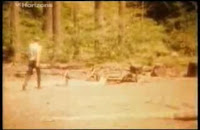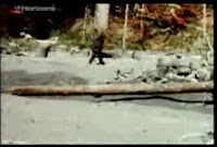 Here we show the first two clear strides the creature takes in the film, and an image of just how high the sand bar was that Roger had to bound over to get his filming spot (this crossing is seen as a frantic white blur in the film). Then we see a blurry Patty entering the most well known part of film terrain, by the long, fallen log.BIGFOOT SCREEN CAPTURES (click to enlarge images somewhat):