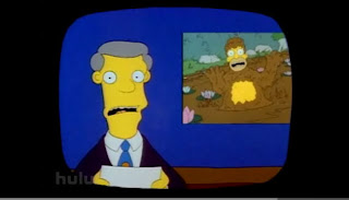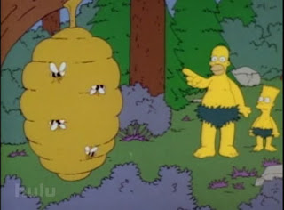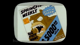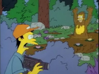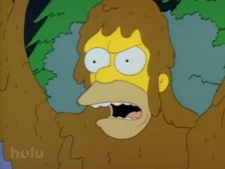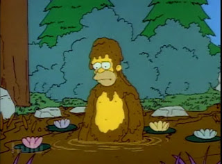 In the Simpsons TV show's first season Homer and Bart go feral, dressing in leaves and roaming the forest. Then Homer decides to eat honey... from the hive. Needless to say, he becomes a Bigfoot after rolling in some mud to escape the bees' attack, and enters the annals of tabloid journalism history. Actually, this episode displays well the way hype and hyperbole, rather than reason, dominate the coverage of the Sasquatch topic.