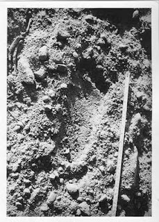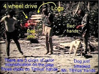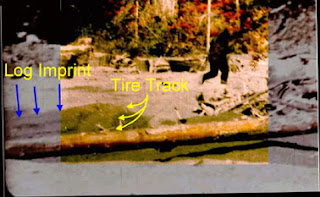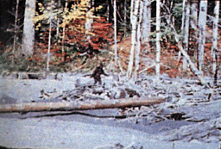 Images: Above, one of the BCM trackway prints (looking suspiciously like one of the footprint stompers that Ray Wallace made--or did Wallace copy these?) Below, Patty on Bluff Creek. MK, if you want to see RED just look at those red leaves in the background--you don't NEED "three clicks" of exaggeration.