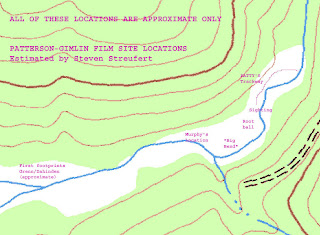 Images: Three film site location estimates, Perez after Dahinden, from Barackman, and our own rough estimate, below. Estimate only! CLICK TO ENLARGE.