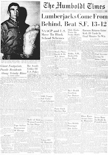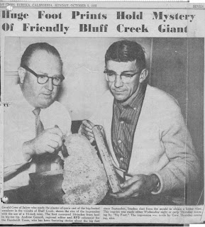 Images: A page from Jeff Meldrum's Sasquatch: Legend Meets Science, featuring Al's prints; below, Jerry Crew in the News--the original Humboldt Times 1958 article, front page, and another image of him with the track cast.