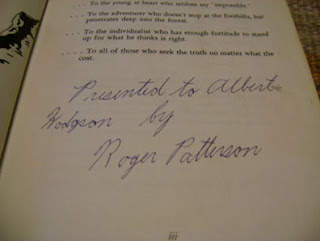 [Al shows his copy of Roger Patterson’s book, and the inside where it is personally inscribed to Albert Hodgson. Photos are taken, see above.]