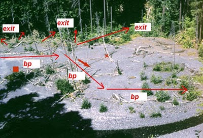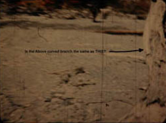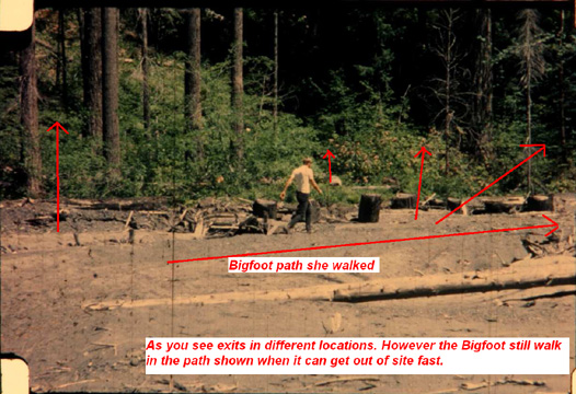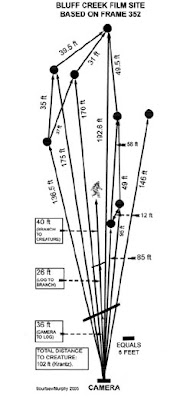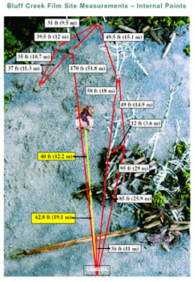 BIGFOOT BOOKS: OK, first: I meant about the trees--IN THE BACKGROUND, behind the creature, where you say Bob Gimlin is hiding. This: those film site dimensions were well documented shortly after the film was made. I have the various books with the distances diagrammed, and a photo taken from the hillside above showing a man where the creature walked. It is moving basically through the middle of the sand bar, and there is a fair distance between the figure/subject and the background trees. Hence, it was NOT like you show in your reenactment with the fellow hiding right behind in the bushes as you walk by. Those bushes/trees at the edge were about 30-40 feet or more behind the creature/subject, and hence, Bob Gimlin would have to be HUGE to appear to be more or less the same size as the creature/subject in the "image" you highlight.