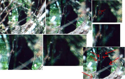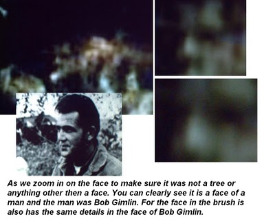 THIS IS PURE PAREIDOLIA, AS GIMLIN WOULD HAVE TO BE HUGE TO APPEAR ESSENTIALLY THE SAME SIZE AS THE CREATURE WHILE SITTING SOME APPRX. 40-60 FEET BACK INTO THE BRUSH. PLUS, IF IT WAS HOAXED, WHY WOULD THEY RUIN IT WITH A GUY IN THE BUSHES? I ALSO "FOUND" AND "SHOWED" TO YOU HOW THERE IS ANOTHER "GUY" SITTING RIGHT IN FRONT OF GIMLIN, AND THEN A BUNCH OF TINY DANCING BABY BIGFOOTS ALL AROUND HIM. ARE THESE ALL TRUE THINGS, THEN?