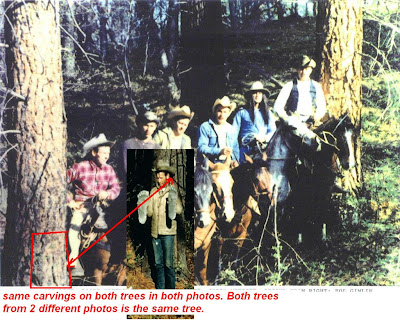 Another thing I like to also point out. The tree that Patterson was standing by in the footage film at the Bigfoot film site. This tree behind Patterson holding the print in his hand is also found in a photo taken by Larry Lund. The photo shows Roger Patterson and Bob Gimlin and 4 other men on horses and Roger Patterson is by that same tree that he was by with the prints in his hands at the Bigfoot film site on Oct 20 1967. Now the photo taken by Larry Lund was also taken in 1967 as well. Now it was told that 3 reels of film was filmed that day and this is told by Patterson and Gimlin. Now on reel 2 you can find two other men on that reel shot at the film site of the Bigfoot on Oct 20 1967. Those men are Jerry Merritt and Bob Heironimus and both of these men are on reel 2. Now as I came to this part in my research I look at the photo taken by Larry Lund again and this is what I found out. Roger Patterson had the same clothes on in the Photo by Larry Lund and in the footage. Now Jerry Merritt and Bob Heironimus also had on the same clothes on as seen in this photo by Larry Lund and also on reel 2 shot at the Bigfoot film site Oct 20 1967. The question is how can all 3 of these men in this 1 photo have on the same clothes that they have on in the Bigfoot film. The answer is they all was taken on the same day. Yes they had to take the photo and shot the film on the same day for all of these 3 men have on the same clothes in this 1 photo and on the film. So you see as I was going over this film and photos even I came up with some questions that need answers too. This 1 photo taken by Larry Lund show Patterson by the same tree and also all 3 men that are on reel 2 having the same clothes on. So you see you are not looking at it from both sides you are just looking at it from the side of other. Think about it. How can Patterson be by the same tree in this 1 photo and film and these 2 other men with Patterson seen on reel 2 shot at the film site on Oct 20 1967 having the same clothes on in both photo and film when they claim that Patterson and Gimlin was the only two there think about before you answer.