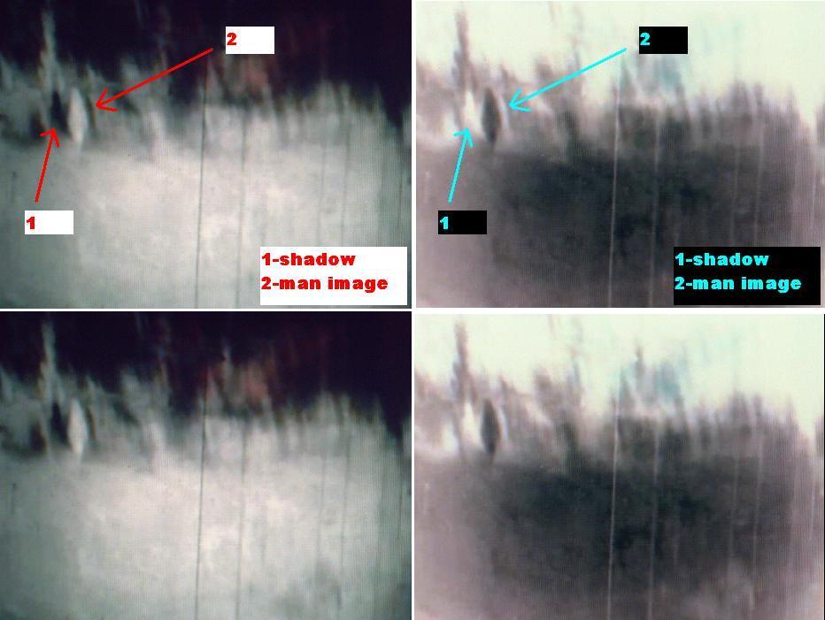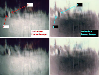 AGAIN, WHY WOULD THEY BE THERE? LOOK AT THE OTHER FRAMES AND YOU WILL SEE THESE ARE JUST BLURRED WOOD DEBRIS OBJECTS. IF THEY WERE REALLY MEN THEY WOULD ALSO BE AS BLURRED AS THE WOOD ON THE GROUND. ALSO, PLEASE EXPLAIN THIS COMPLEX TECHNIQUE OF BLURRING SOMETHING OUT WHILE LEAVING SHADOWS BEHIND, YET LEAVING THEIR WATCHES VISIBLE.