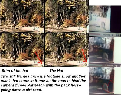 For like I said the stories change all the time like it is told Gimlin took Miss Patterson to court for the rights to the film and then after he got rights he sold the rights back to her for only 26 dollars. Now why take someone to court for rights to the film and then sell it back to them for only 26 dollars. Then even Bob Gimlin made claims to it was Roger Patterson film not my film it was all Patterson I have nothing to do with it I was just there that is it. It is all Patterson. And then he makes a claim it may have been a hoax. So you see my point is these are all stories and words that are told nothing to show as proof. However this is what is told that Bob Gimlin said in interviews. And the part where he said it may have been a hoax was a recording of him saying this. Now what I am doing is showing things that are in the film and showing these parts you can find in the film likeThe hat