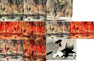 LEROY BLEVINS: Ok here is another thing I like to point out. I am sending a photo with this e-mail so you can look at what I am talking about. It was told in a interview; Patterson was the man with the camera however they only show Patterson in front of the camera and never Bob Gimlin. Now they told the story of that day that Patterson was filming Bob Gimlin going down the road with the pack horse and that Bob Gimlin was with the pack horse and Patterson had the camera. But by looking at the footage you only see Patterson with the pack horse not Bob Gimlin. Back to the story Patterson was filming Bob Gimlin going down the road with the pack horse and as they both made the turn they seen the Bigfoot. But however the part they claim with the man going down the road with the pack horse was Bob Gimlin is not Bob Gimlin it was Patterson. Now I took frames from each part of this footage and looked over them and the man the footage shows is only Roger Patterson not Bob Gimlin. The footage only shows Patterson with the pack horse not Bob Gimlin. For by the frames you can see the man going down the road with the pack horse has the same clothes on and on the same horse and also riding the horse the same way. Now they claim and it is told that was Bob Gimlin when it fact it was Roger Patterson. Last night I gone back over some of the parts of the footage in slow movement looking back over some of my research. Now this time I even had some one look at the videos as well. Now I set my nephew down and asked him to look over what he see in the videos and write down the things he see. Now he know nothing about my research on the film The only people know about my research on the film in my family is my wife my kids don't even know that much about my research for we don't talk about it with them. So my nephew looked over the videos and wrote things down he seen in the video. Now the man that my nephew works with was also here and I took him to the side as my nephew looked over the film and then I as k him to do the same thing. Now these are two other men that never even seen the footage before and they know nothing about Patterson or Gimlin or the film it self. and here is what both of them told me what they seen. They seen a image of a man taken out of the footage so I asked them what they made this claim and they show me part of the video and said see the shadow of the man right there. And then they told me about the image of the man walking off to the right so I asked them where do you see this and they point to part of the video and they said see this image shape like a man walking. Then they also told me in two part of the video they seen the this thing stopped. So I asked them to show me and also asked them why you say this. My nephew said you can see the thing stop and he count the frames and in 7 frames this thing was just standing there and then it started to walk again. Then he said right here you see the this thing stop and count 39frames and the Bigfoot is still in this 1 spot. So you see the thing stop two time and just stand there with it's hand to it's side.Now the thing they are talking about is the Bigfoot for they did not knew they was looking over a Bigfoot film. However what I am trying to say here are two men that never seen this film before and they both seen the same things as I point out. Now the funny thing is I did not knew myself about the second time the Bigfoot stopped however they did and when they show me it was there the Bigfoot stopped in this 1 location and then you see the camera going up and down and showing the ground then you see the bigfoot again and that Bigfoot was in the same spot and I count and it was 39 frames. But my nephew friend said it was 41 my nephew said it was 39 but it was 39 frame. Now the part of the footage I am talking about is after the first part of the Bigfoot when they first seen it. As Patterson was running with the camera and you see the ground well just before you see the part with the ground you see the Bigfoot stop and then you see the groun d will as the Bigfoot stopped start to count the frames The Bigfoot stop then you see the ground then it shows the Bigfoot again after he stop running this Bigfoot in still standing in the same spot and then it started to walk again.Now these men don't do research of any kind and even they seen these thing I point out and even point out something I never seen before. So you see if this film was real as they claim it to be then why was they so many flows in it.