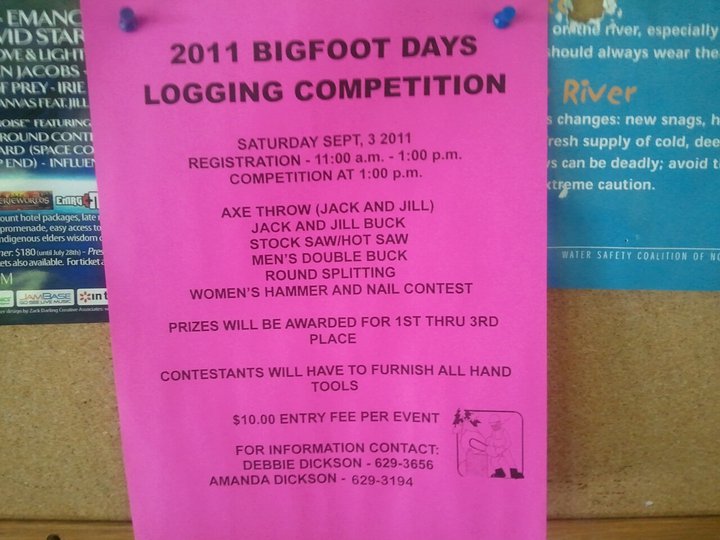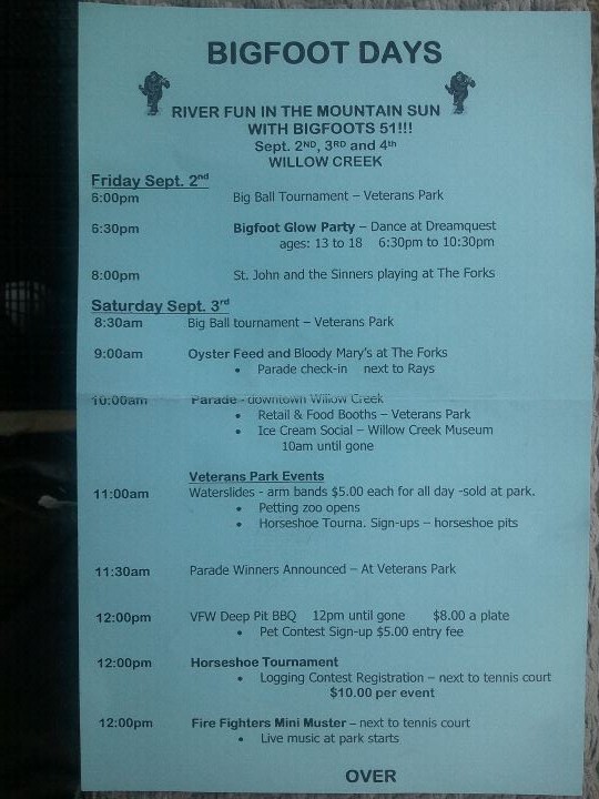 Willow Creek hu-man Commerce Chamber ask me to put up blog about thing called BIGFOOT DAYS. It happen this weekend. That is on hu-man calendar September 3 and 4. They give me food. Me take.