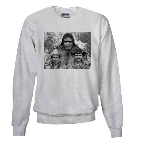 | One of the shirts available through the online T-Shirt Store, this one featuring a very cool image Mike Rugg drew of Patty Bigfoot, with Roger Patterson and Bob Gimlin. |
