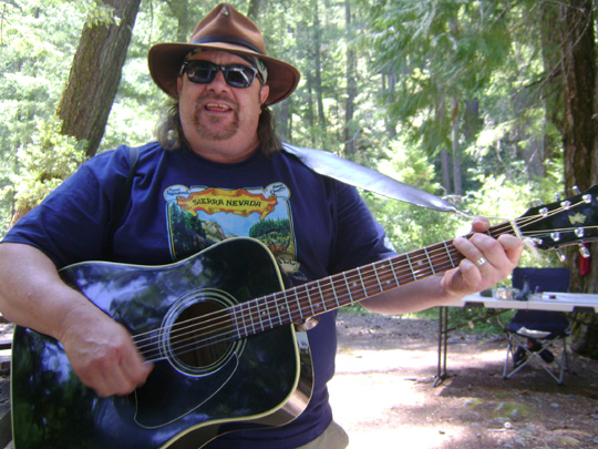 | Bigfoot Troubadour, Researcher and Sasquatch History Buff Tom Yamarone performs his new song, "Hodgson's General Store. He came to the PGF site the first day out, but missed the group photo above. |