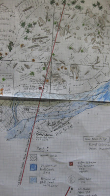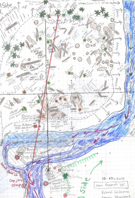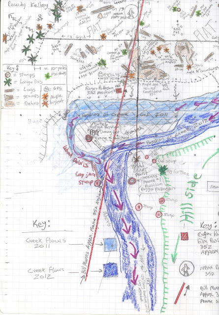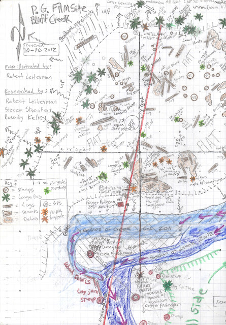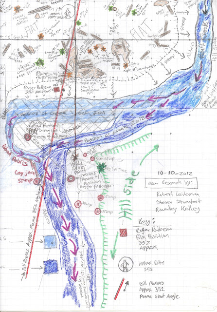 In honor of the 45th anniversary of the PGF I am going to jump the gun and publish some current maps of our work in surveying and documenting the film site as part of the BLUFF CREEK FILM SITE PROJECT. I still have to post all of the information about events and processes conducted over the summer, which included work with Bill Munns on the site. Sorry, I've been busy. Expect those posts to appear here soon, along with the Bigfoot Days 2012 celebration in Willow Creek. For now, enjoy these documents painstakingly created by Robert, revealing the current state of the true Patterson-Gimlin Bigfoot Film Site.