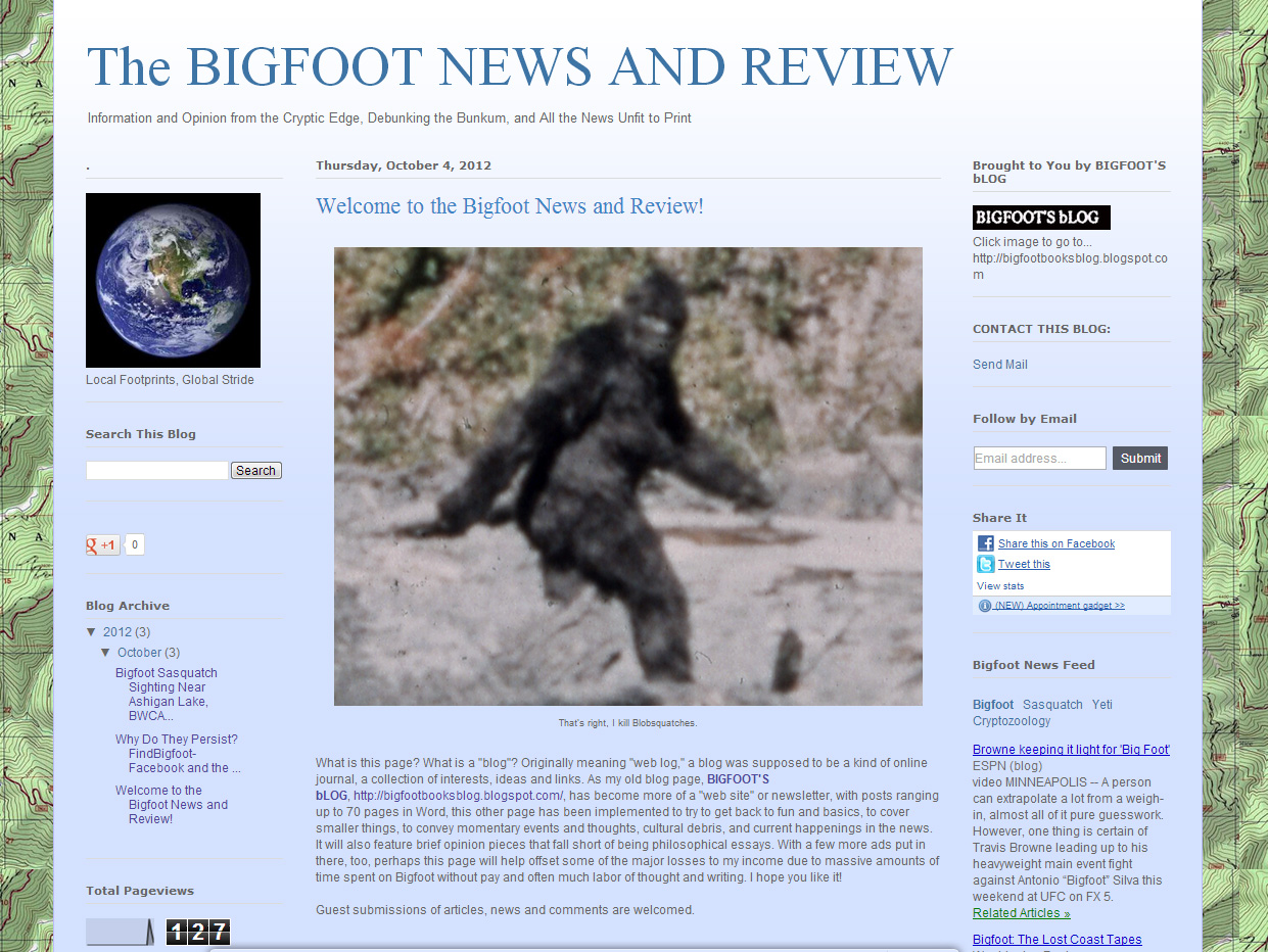 This blog is copyright and all that jazz, save for occasional small elements borrowed for "research" and information or satirical purposes only, 2003-2012, Bigfoot Books and Steven Streufert. Borrowings for non-commercial purposes will be tolerated without the revenge of Angry Bigfoot, if notification, credit, citation and a kindly web-link are given, preferably after contacting us and saying, Hello, like a normal person would before taking a cup of salt. No serious rip-offs of our material for vulgar commercial gain will be tolerated without major BF stomping action coming down on you, hu-man.