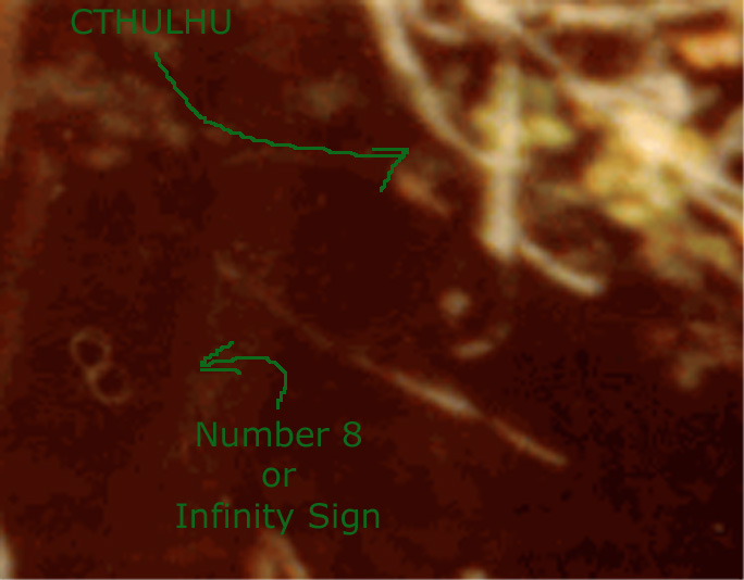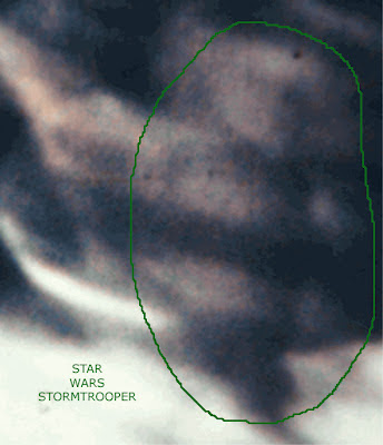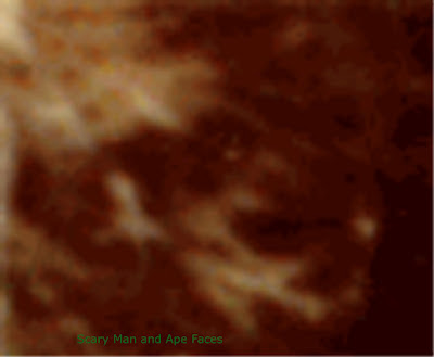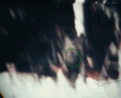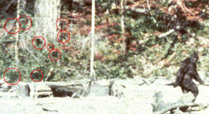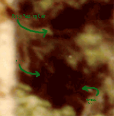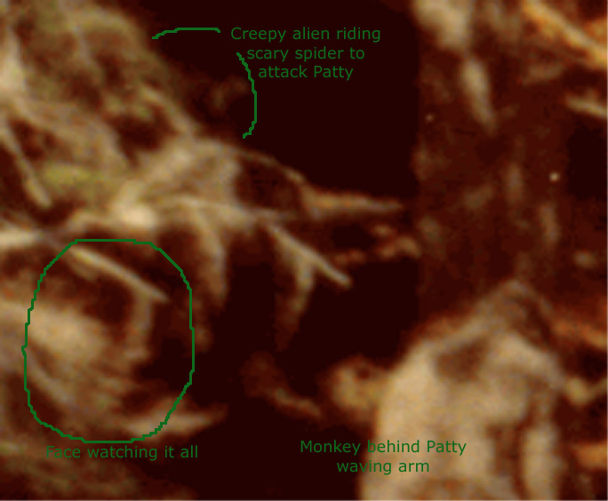 Just like M.K. and his odd offspring, Mr. Lee Blevins, we are going to take an "in-depth look" at the Patterson-Gimlin film in this expedition into the inner reaches of the mind. SEE BELOW FOR EXAMPLES. Click on the images to view in a larger size, gaze at them long enough, and maybe, just maybe, you will find the deep secrets I have found there. If not, well, there are colored circles drawn around some of these hidden mysteries to guide you.