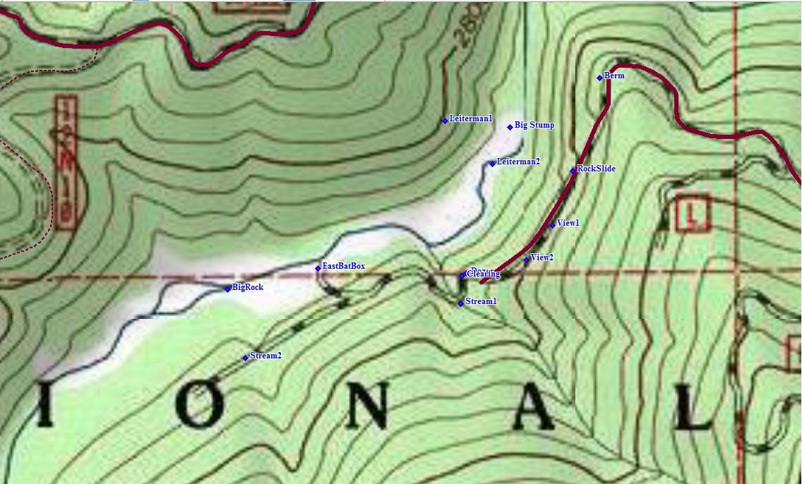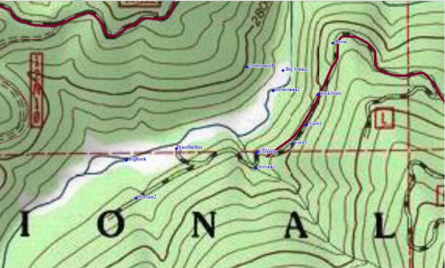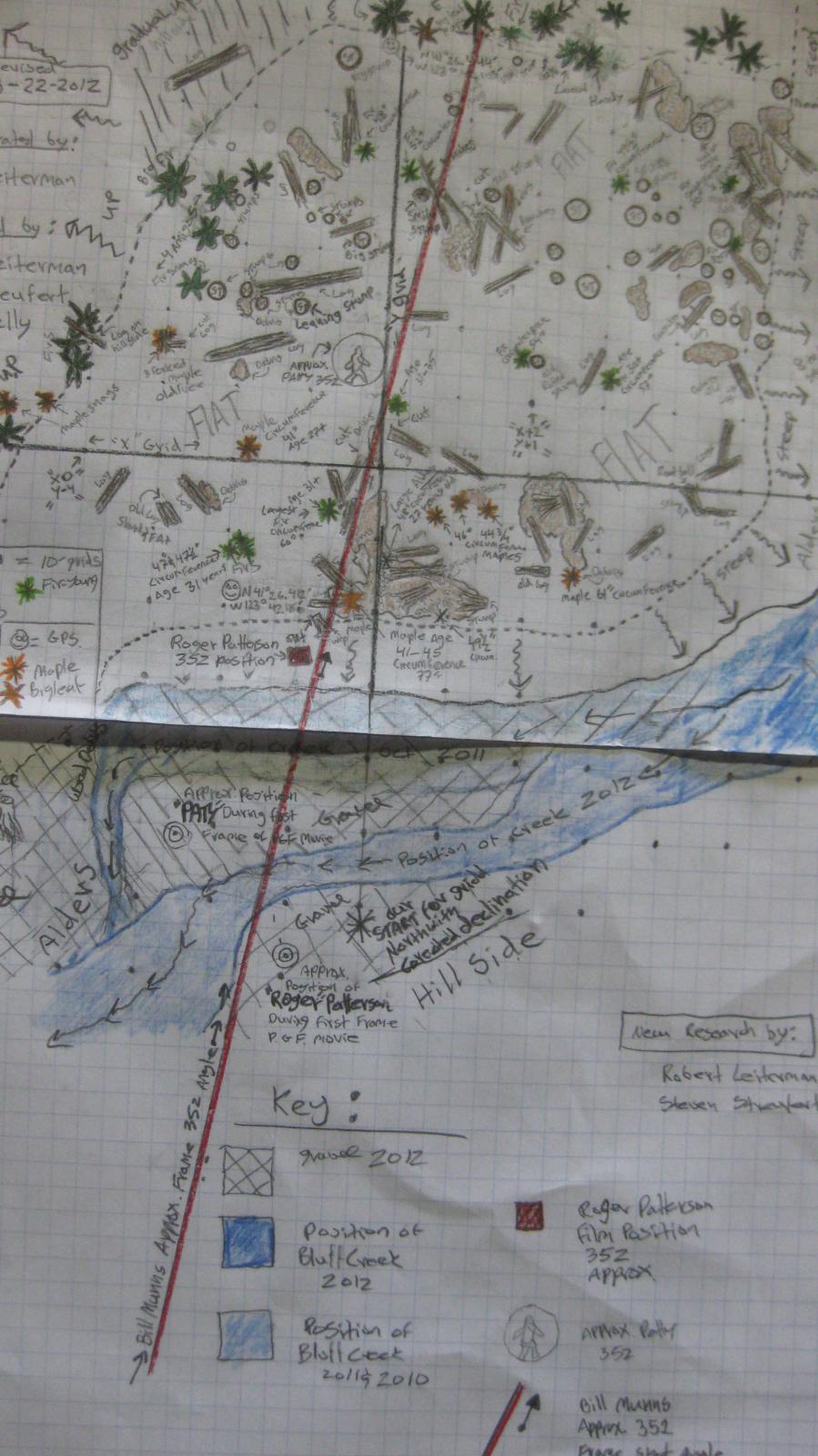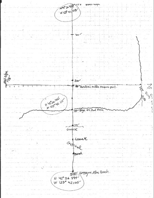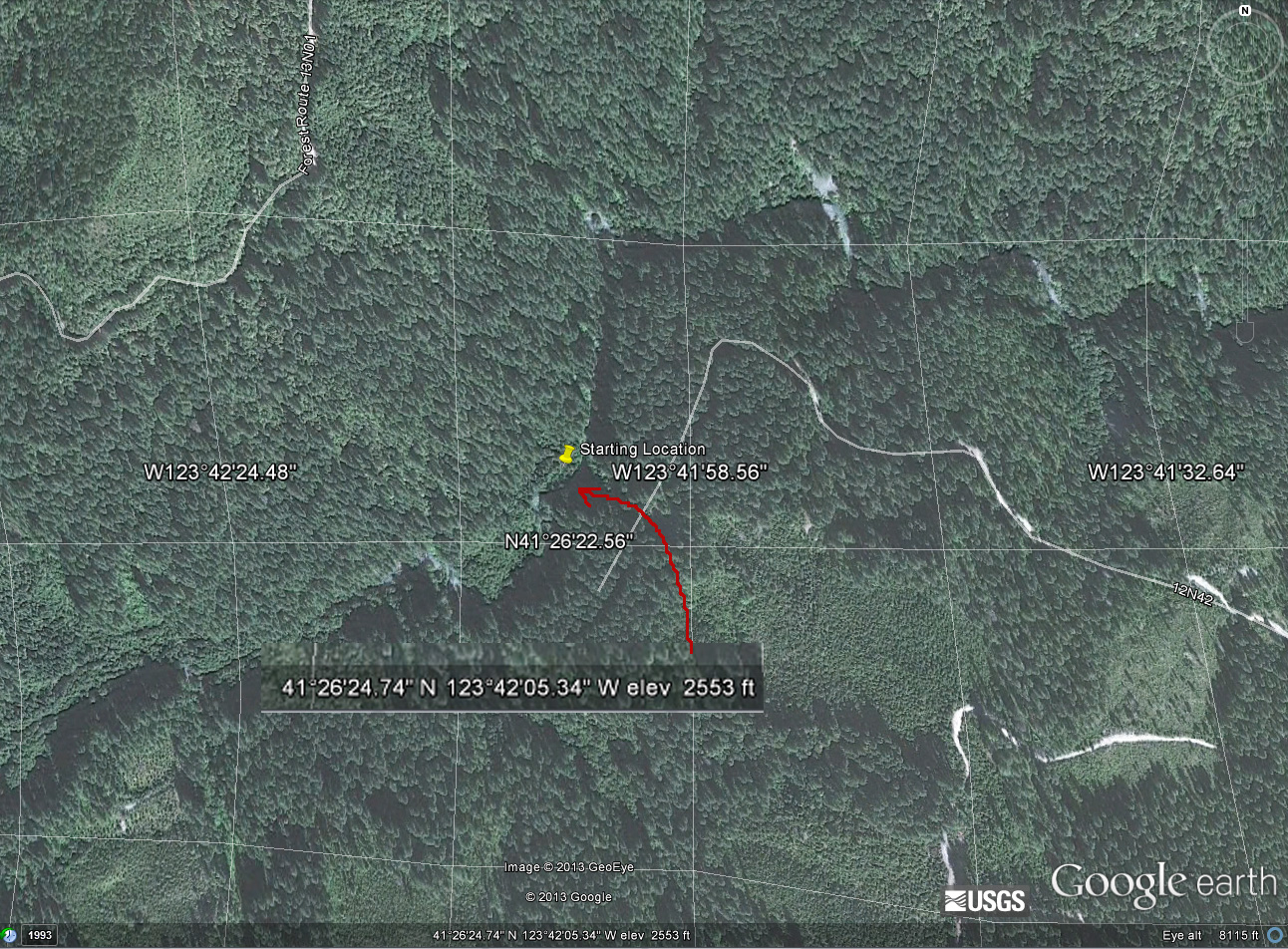 These readings were taken by Ian C., BLUFF CREEK FILM SITE PROJECT founding member around the area and at the film site. The two "Leiterman" readings are the film site itself, added later to the above, though the reading for the upper maker was incorrect due to poor satellite reception down in the canyon at the time. The lower reading may be used on Google Earth and other places to find the exact position of the start of the film action. Some of the points above are off the map given, but still in the area, and may be useful to all.