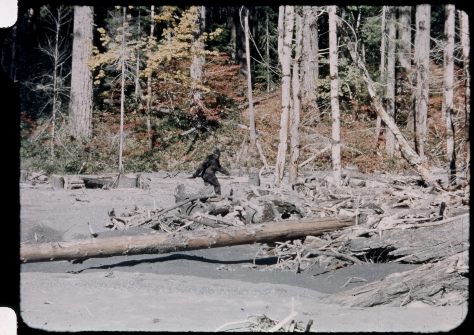 Eventually I spent several hours hiking up and down the creek with print-outs from the film, and I believe it is just not possible to objectively identify the exact location. I did find two large Douglas Firs that could be the one seen in the background of the early frames. The under story in that area is so thick that there is no way to recreate any of the shots from the film. The creek has also moved around a lot over the years and has suffered severe flooding. Also, the road bed that Patterson and Gimlin followed is gone except for a few scattered places.