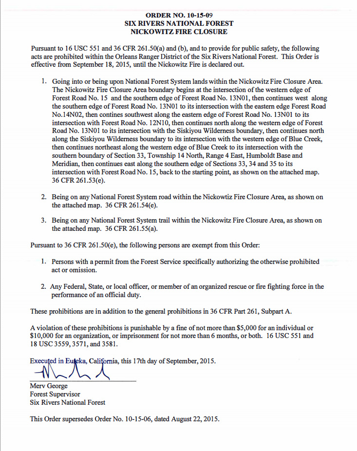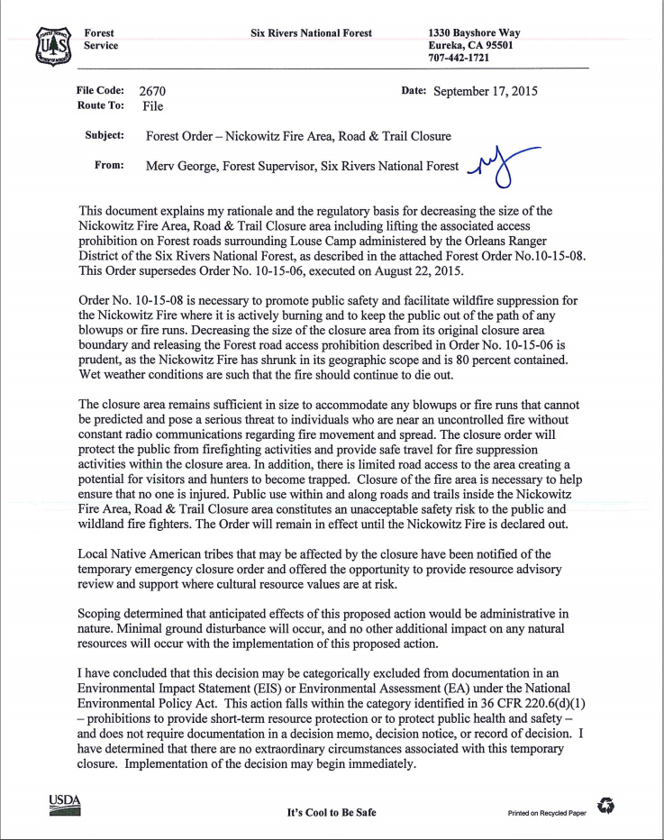 Merv George, head of Six Rivers National Forest, and friend of Bluff Creek Project, signed the new orders a few days ago. Click the images to enlarge and read them.