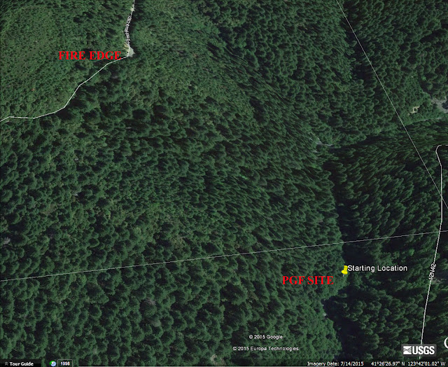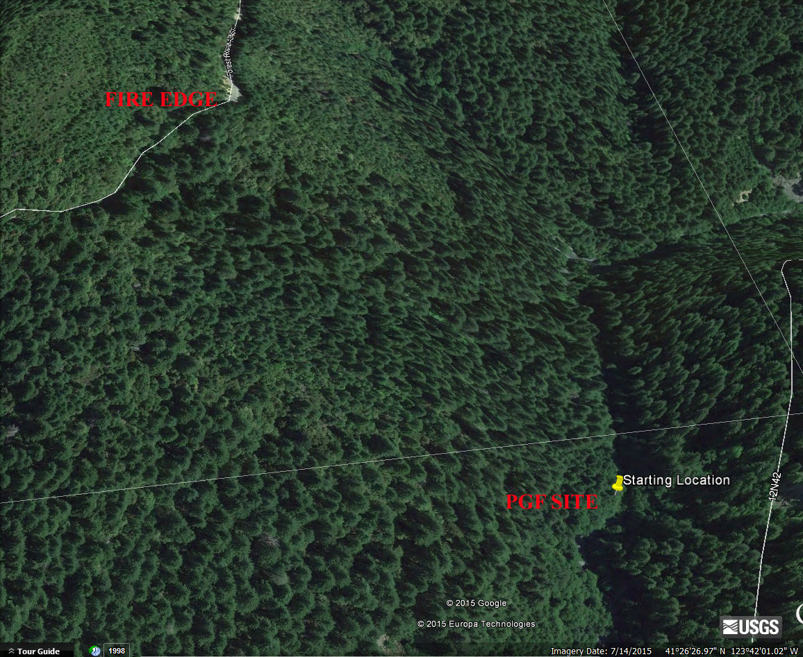 Here's a Google Earth view of the Film Site to lower right, and the fire edge along 12N01 Road to upper right. Just count the trees. It's very close to the site.
