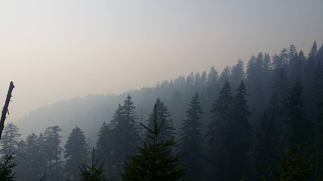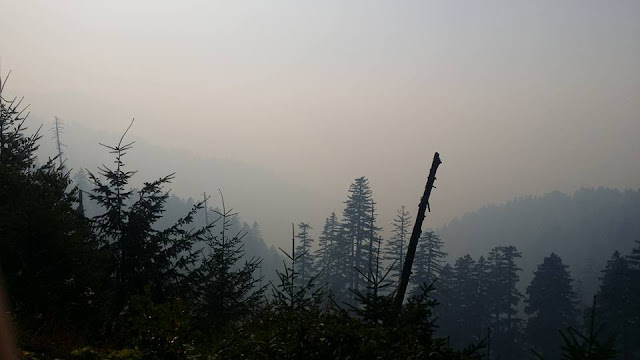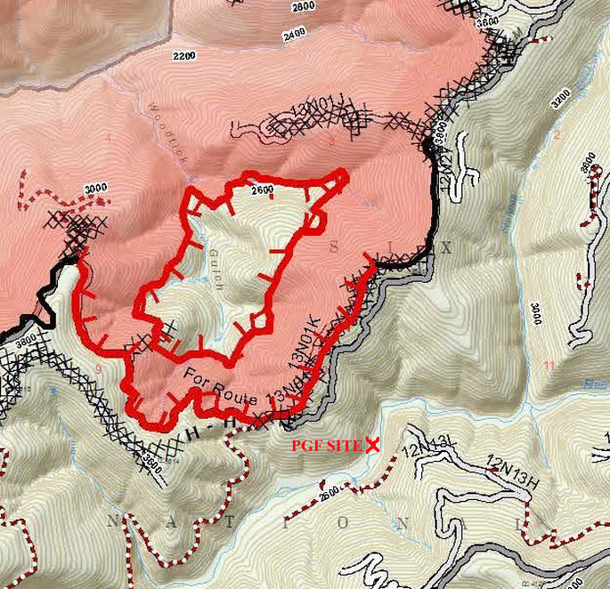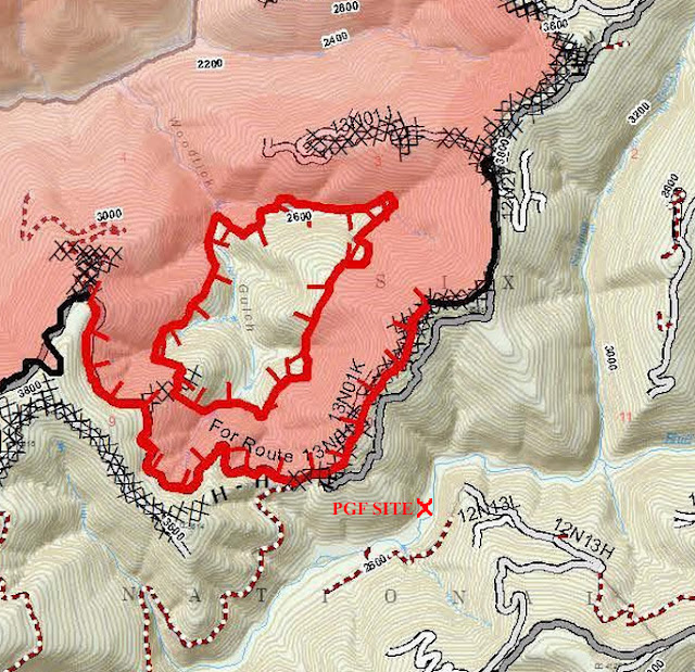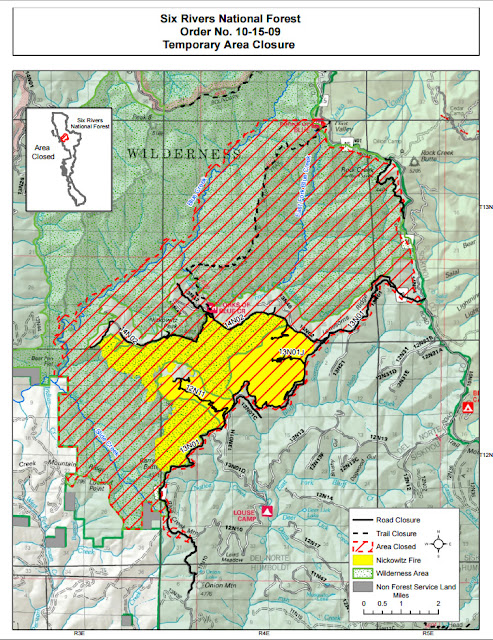 Just in time to be open for a couple of weeks or so before the seasonal Fall closure (technically set for October 1st, if it starts raining), Bluff Creek is open again. The Nickowitz Fire has moved west and north, and is mostly contained. At one point it came to about half a mile from the PGF site, and easily could have burned through the creek basin had the winds changed and blown it down from Lonesome Ridge (see image below). Here are the current orders for closure around Blue Creek, Nickowitz Peak, the upper G-O Road, Onion Lake area, and the edges of the Siskiyou Willderness. Bluff Creek via 12N10 is apparently impossible, but access can be had through the lower G-O Road, Slate Creek Road, or Cedar Camp Road. It appears that Fish Lake/Onion Mountain ("Bluff Creek Road") is closed at the top, before Onion Lake and Onion Mountain. So, access to the PGF site and Louse Camp is only possible from the northern/eastern side.