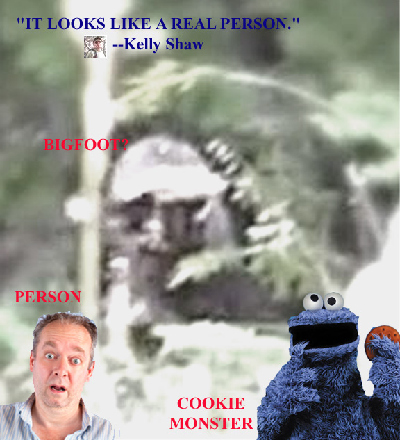 He runs the Rocky Mountain Sasquatch Organization, which is just him, his kid, his wife, and one friend with an obsession with toy helicopters. His videos on YouTube are among the most ridiculous "field research" activities we've ever seen. Wherever Kelly goes, something gets named after Bigfoot, and Sasquatch "evidence" is found literally EVERYWHERE. In every depression in the ground he sees a track, and he sees Bigfoot activity in every broken branch or pile of sticks. He is the darling of clickbait blog, BIGFOOT EVIDENCE, where he gets free advertisement. He does all of this to get .002 cents per view on YouTube. I guess it's worth it to him. Recently, he's gotten worse. He now sees orbs on trail cameras, and Bigfoot blobsquatches in every shadow. Here is a fine example. THIS is his idea of Bigfoot, and he even says "It looks like a real person." Are you kidding me??