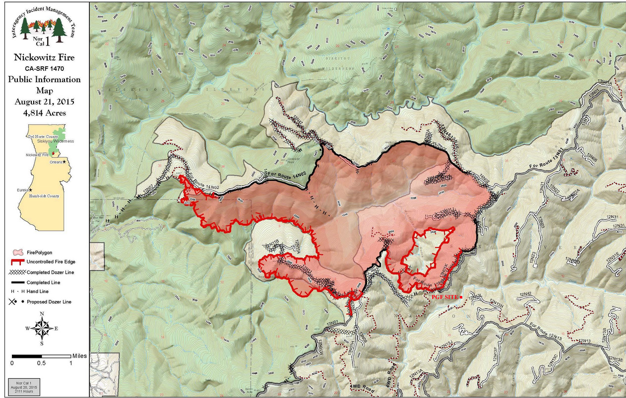 "Overnight humidity on the fire increased to levels much higher than in the past several days. Today a light inversion is expected to lift in the late morning. Steady progress is being made on line construction. Holding and securing the Soapstone Gulch area on the south flank is a priority for Friday as is holding and securing the west flank. Partly sunny skies with areas of smoke is expected for today. The fire is currently 4,818 acres. Please remember that there is a temporary forest closure in place around the Nicowitz fire including a portion of the Siskiyou Wilderness. All roads and trails within the closure area will be restricted to authorized personnel only until the fire is declared out."