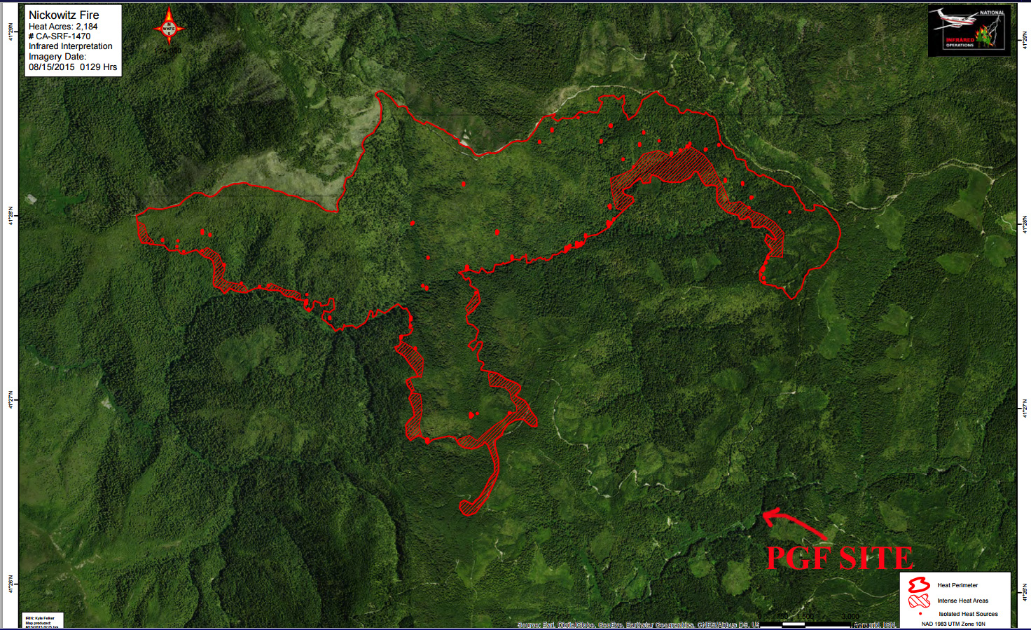 Click to enlarge map. Note location of P-G film site at lower right of fire perimeter.