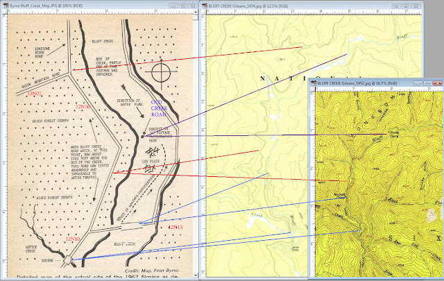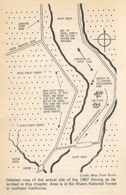 Here are some corrections and clarifications I had to make to Peter Byrne's ridiculous PGF Film Site/Bluff Creek map (from his 1976 book, "The Search for Big Foot") so that some sense could be made of it. I think Byrne was intentionally obfuscating the location to keep it to himself. What other explanation can there be? Also, I interviewed him a while back (HERE) before we found the PGF site, and his directions to the location were quite far downstream from the actual spot. It is stuff like this that made it difficult for us to relocate the site. Distances are totally deceptive in the Byrne map. Actually, it's one mile from the first bridge to the second, and then three miles up the creek to the film site.