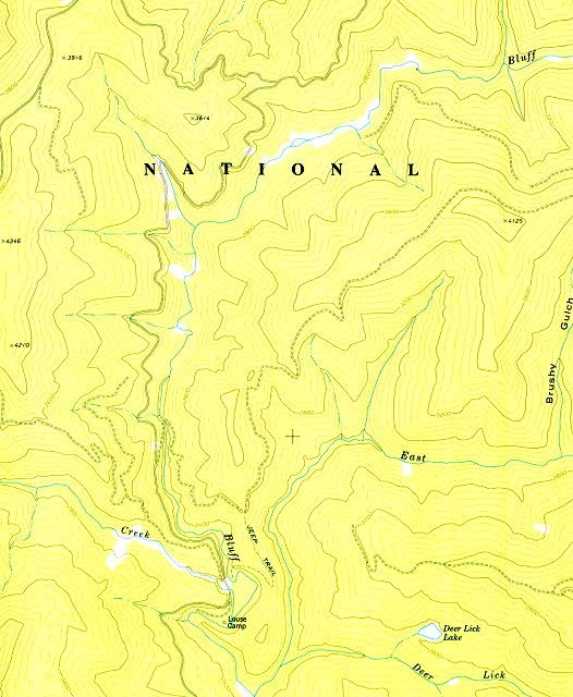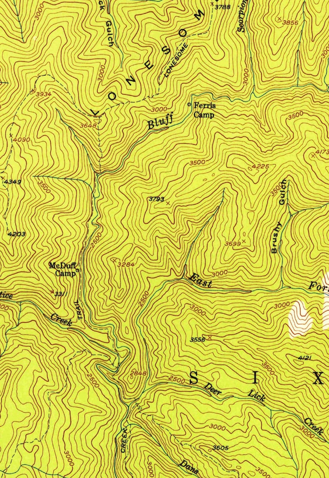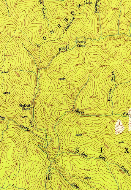 Here are the other two maps, the earlier one first. Note the location of "Ferris Camp" is the PGF site. "McDuff Camp" was at the location of the current bridge over Bluff Creek, one mile up from Louse Camp. We think that this is where Patterson and Gimlin camped, just up the creek a ways from the road, according to what Bob Gimlin told me in Yakima last year. "We got to the bottom of the road, where it meets the creek, and then we just crossed the creek. It was right there," Bob said. Right there across the creek would have been over a ford at that point, as there was no bridge there at the time. The ford would have crossed over the creek and headed upstream on a jeep trail grade road that went along the creek all the way past the film site back then.